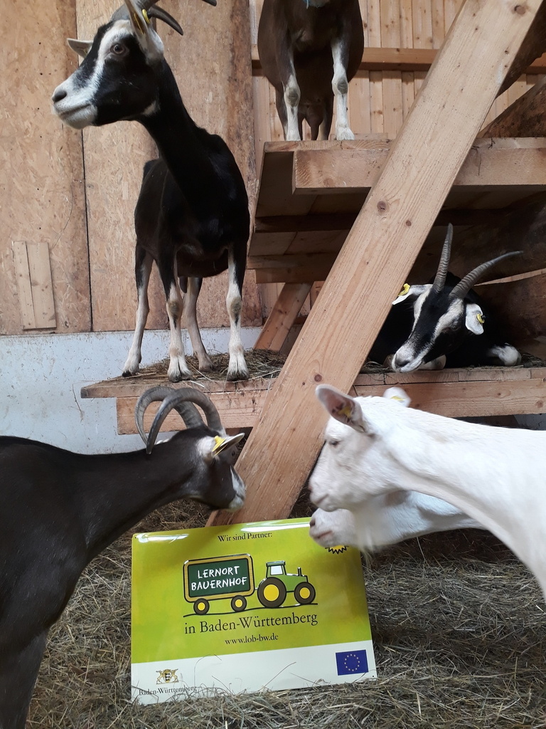 Wir haben einen kleinen Milchziegenbetrieb und verarbeiten die Milch unserer Ziegen komplett selbst zu Käse. Mit Kindergruppen auf dem Hof füttern wir die Ziegen und streicheln sie. Ein kleines Hofquiz regt die Kinder zum selber Nachdenken und beobachten an. Am lustigsten ist es bei uns im Stall im Frühling, wenn die Zicklein durch den Stall toben.Milchverarbeitung und Grünland sind weitere Themen, die wir bearbeiten können.