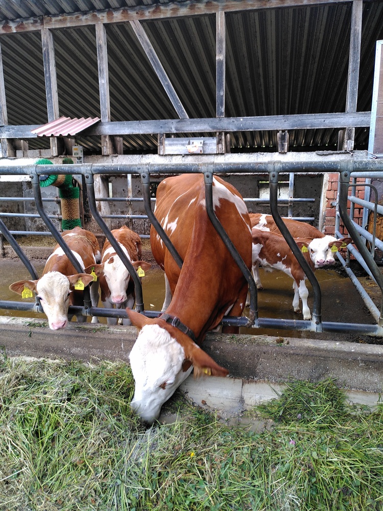 Die Kälber werden Mutter-/ Ammengebunden aufgezogen, das Jungvieh hat in den Wintermonaten viel Platz im Stall mit Laufhof und ist im Sommer auf der Weide.
